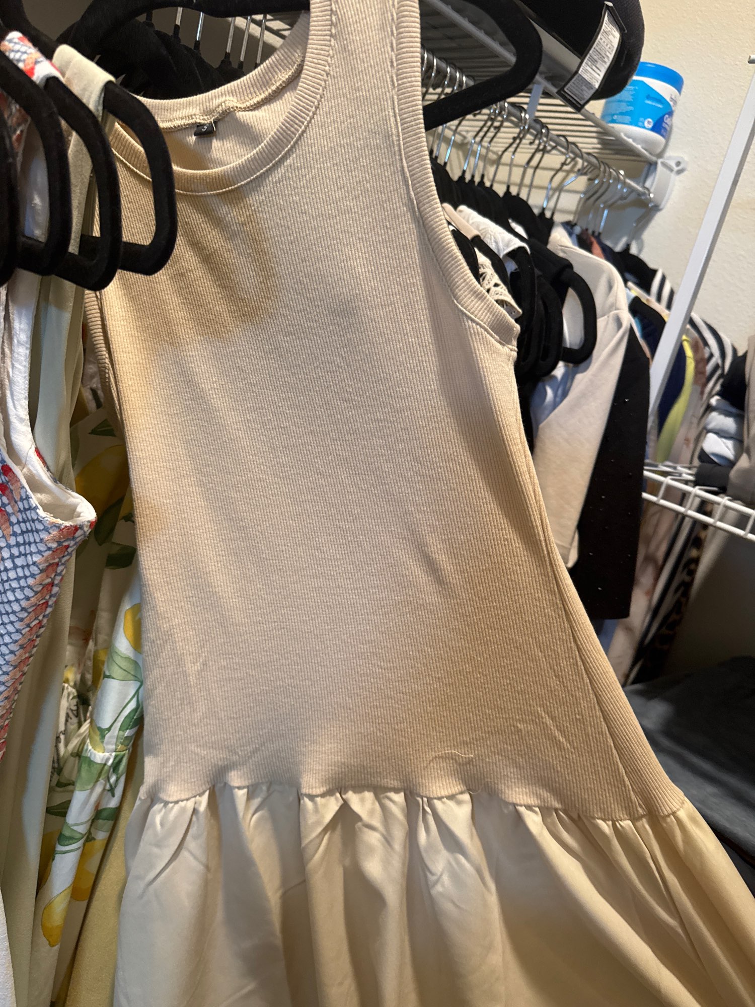 Simple dress that is very lightweight. Definitely go up a size, i wear an xs in most things and the small cut me under the arms, will be ordering a medium next.